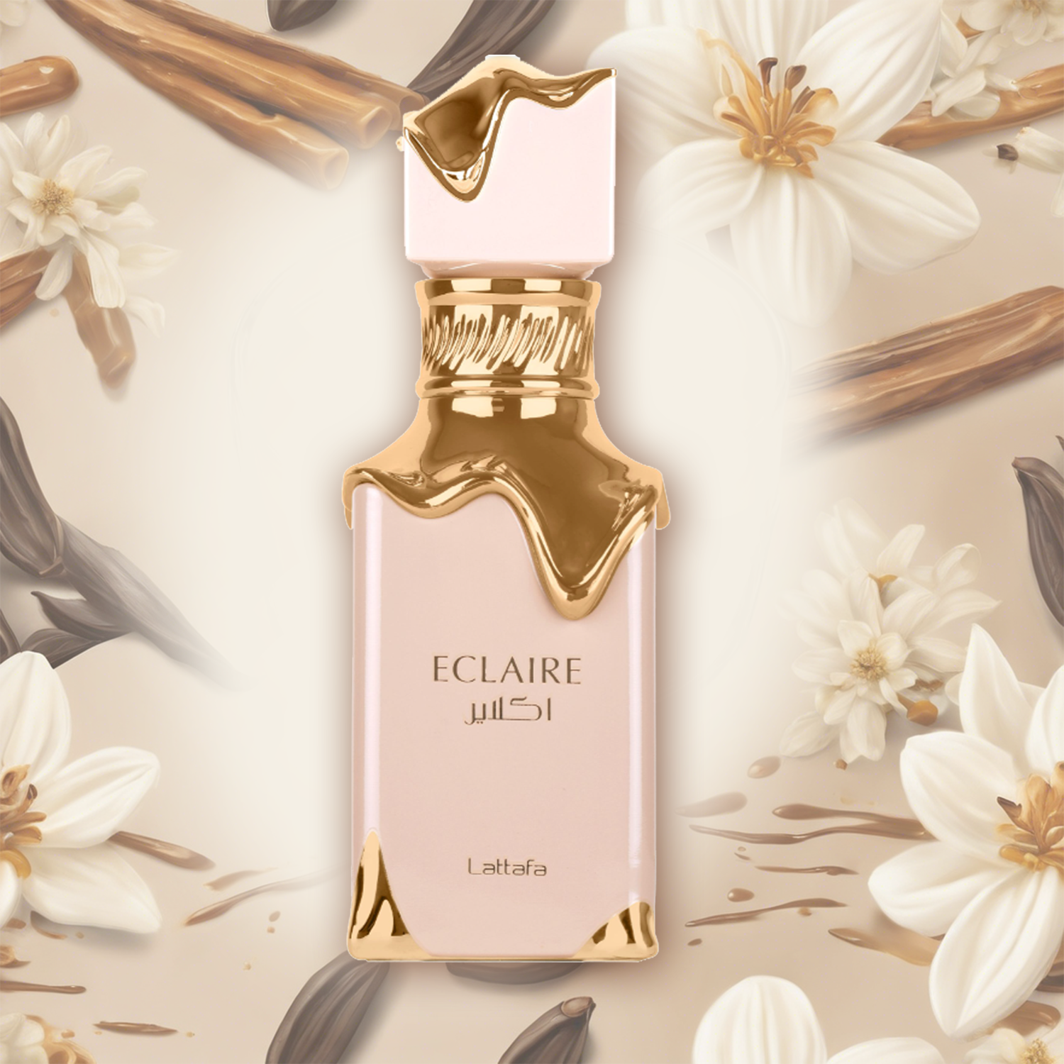 Eclaire de Lattafa Perfumes é um perfume Floral Frutado Gourmet Feminino. Esta é uma nova fragrância. Eclaire foi lançada em 2024. As notas de topo são: Caramelo, Leite e Açúcar. As notas de coração são: Mel e Flores Brancas. As notas de fundo são: Baunilha, Pralinê e Almíscar.