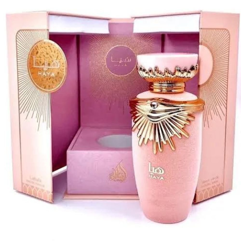 Haya de Lattafa Perfumes é um perfume Feminino. Esta é uma nova fragrância. Haya foi lançada em 2022. As notas de topo são: Champanhe, Morango, Rosa, Tangerina e Laranja Sanguínea. As notas de coração são: Gardênia, Jasmim e Orquídea Baunilha. As notas de fundo são: Âmbar, Sândalo e Castanha.